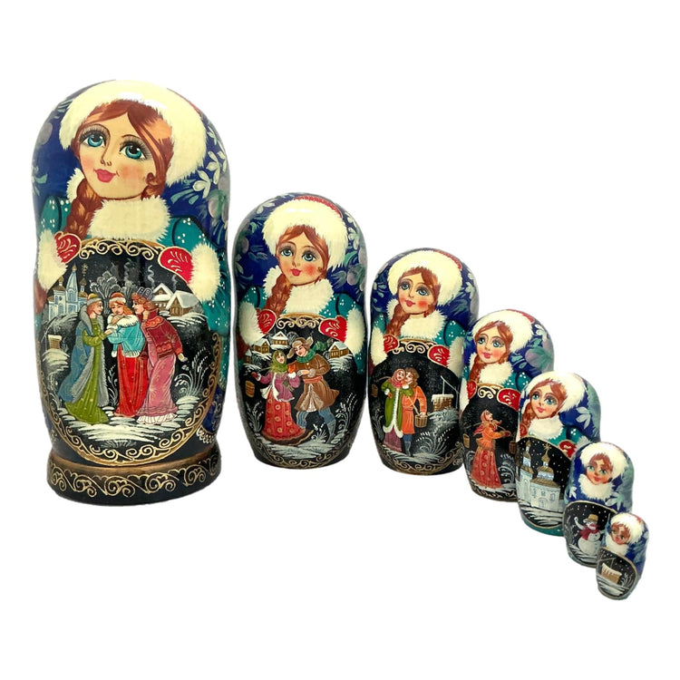 This authentic Russian dolls are set of 7. The nesting dolls depicted winter scenes at a Russian village. Matryoshka hand made out of wood and hand painted. This would be an impressive gift for any occasion.