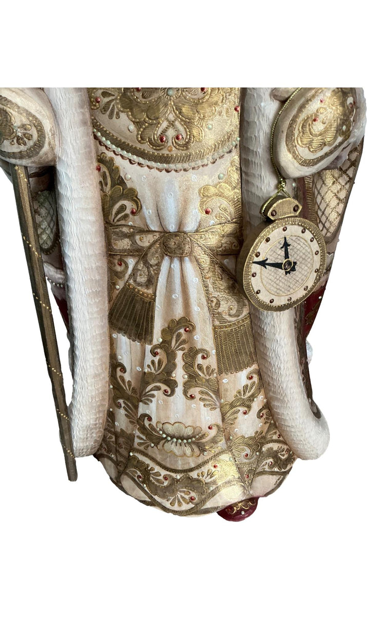 The clock will soon strike midnight and a new Christmas Day will begin. This Russian Santa is all dressed in his furry hat and elegant coat of red and gold with individually carved wooden buttons. Father Frost has journeyed through the forest to arrive just in time to bring Christmas joy to people of the village and we can see that his eyes have followed the star that has guided him and reminds us of the true spirit of Christmas. Hand carved, hand painted and signed by the artist, this showpiece Santa will be the center of your collection.