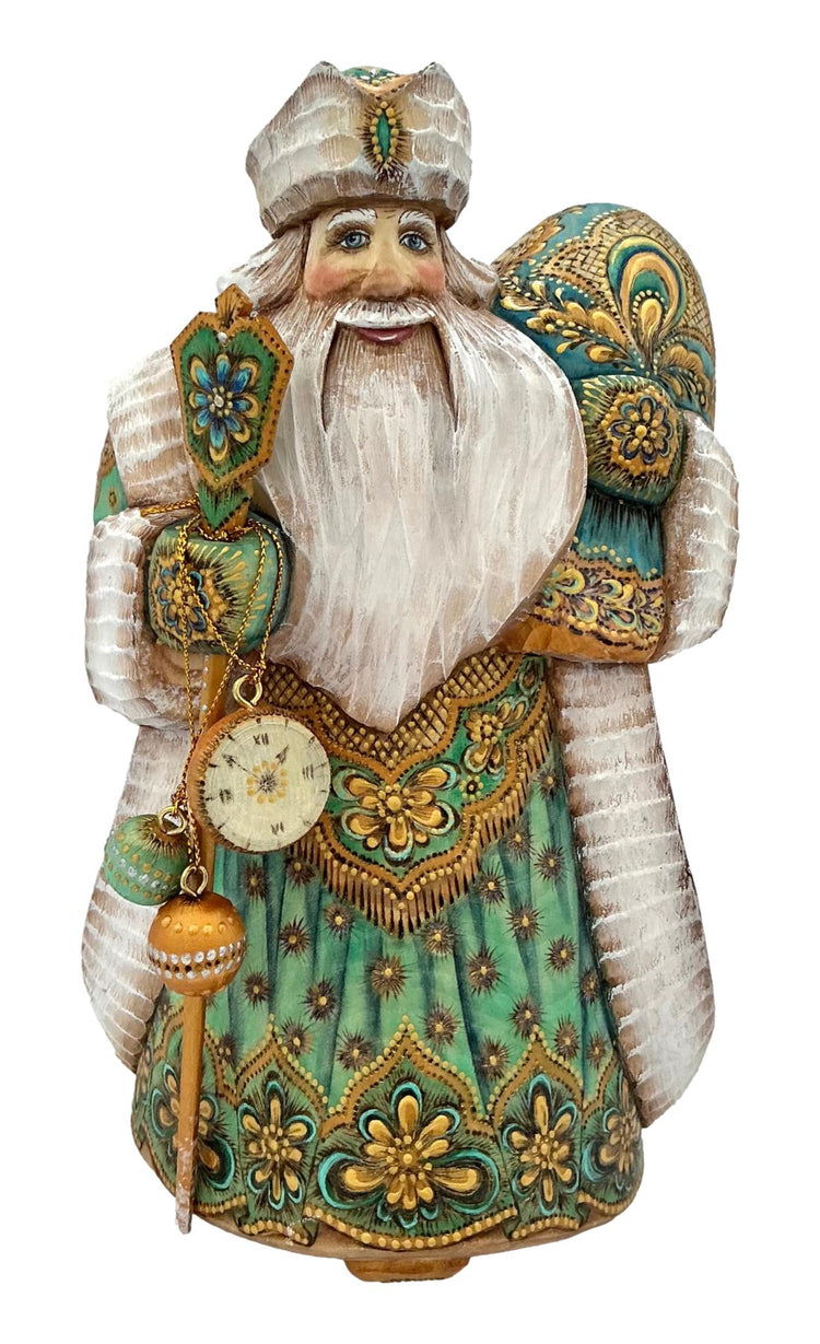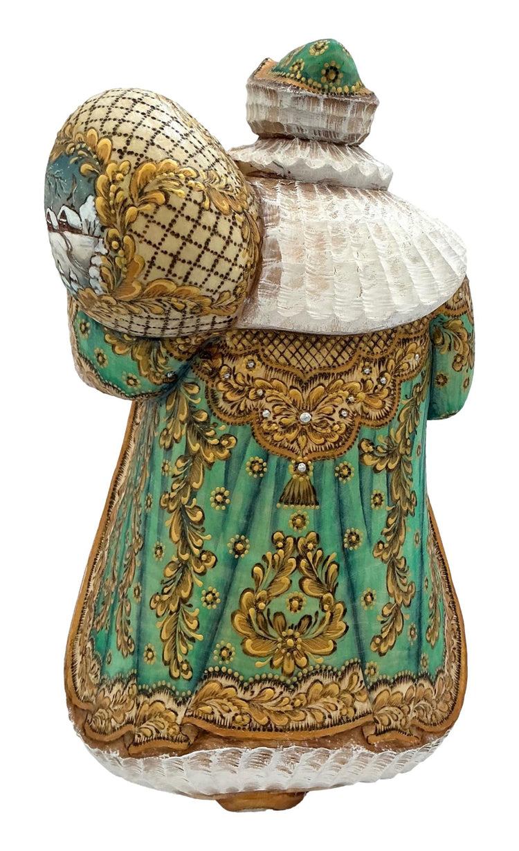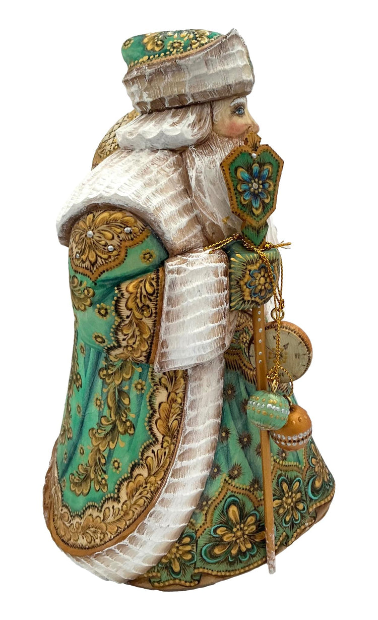 Theambergiftshop sells the best available unique Russian art work. This authentic Father Frost is an example of the high level of artistry. This beautiful masterpiece is wood burn first with exquisite details, then hand painted in an emerald green with gold accents. Gorgeous details in the pattern of Santa’s winter robe compliments an outstanding carving artwork on the Santa. This magnificent Russian Santa will be a star of your collection or unforgettable Christmas gift for someone special in your life. Invite this handsome fellow and enjoy his company for many years to come. Hand carved from solid wood and hand painted.