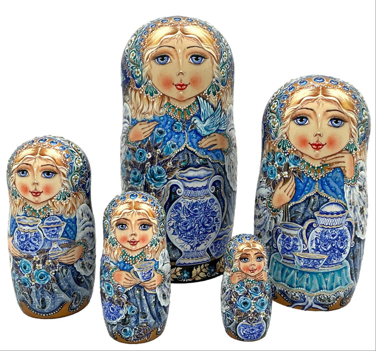 It’s a tea time with a famous Russian dolls - matryoshka. Set of 5 features beautiful Russian girl with a blue eyes. She dressed at gorgeous summer outfit and ready to serve a tea for whole family. Artist G.Ivanova used different shades of blue colors what gave this nesting doll unique look.